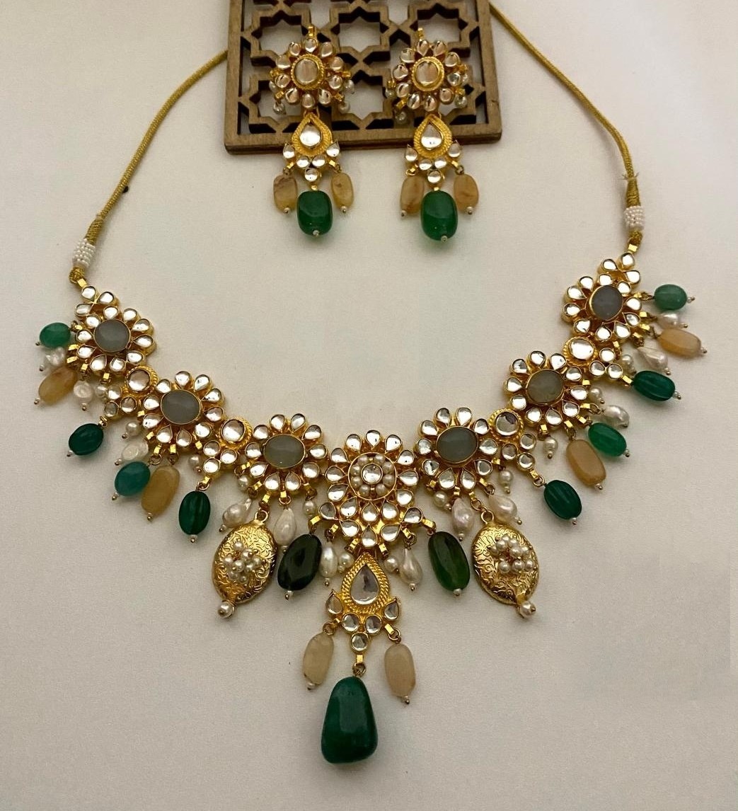 Delicate as spring and radiant as celebration, Bahaar-e-Zeenat blooms with timeless beauty. Adorned with intricate Kundan craftsmanship and soft golden hues, this necklace set captures the freshness of new beginnings and the grace of royal tradition. Each detail sparkles like a petal kissed by sunlight, making it perfect for festive occasions, weddings, and graceful soirées. Bahaar-e-Zeenat — a blossoming symphony of elegance, heritage, and feminine charm.