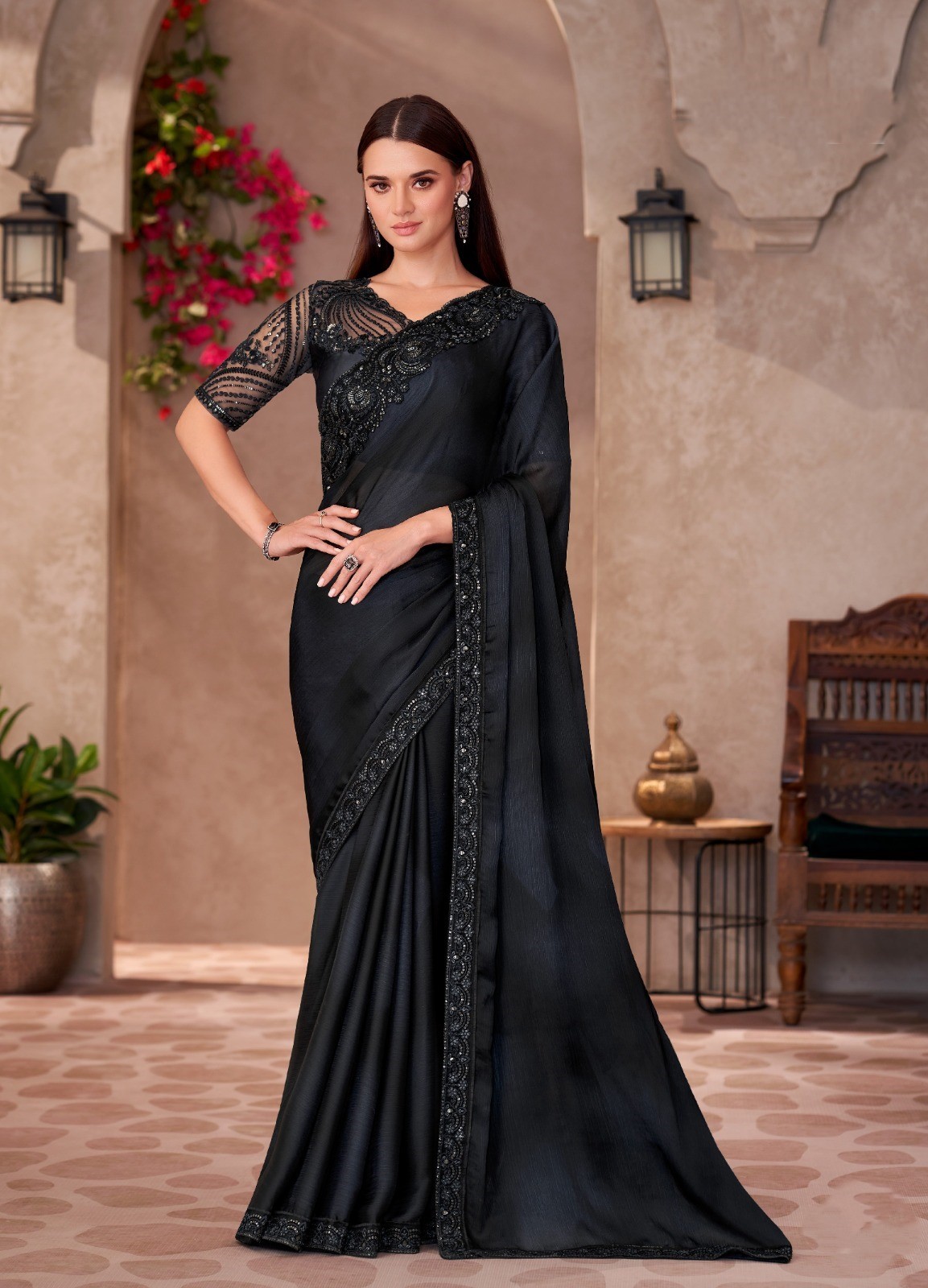 A symbol of timeless sophistication, the Black Opulence Saree exudes unmatched elegance. Crafted in delicate sparkle chiffon, its flowing drape shimmers with every movement, while the intricate embroidery adds a touch of regal artistry. The deep black hue, paired with subtle embellishments, makes it a perfect choice for evening galas, weddings, and grand celebrations. Radiant yet refined, this saree is designed for the woman who carries her charm with power and poise.