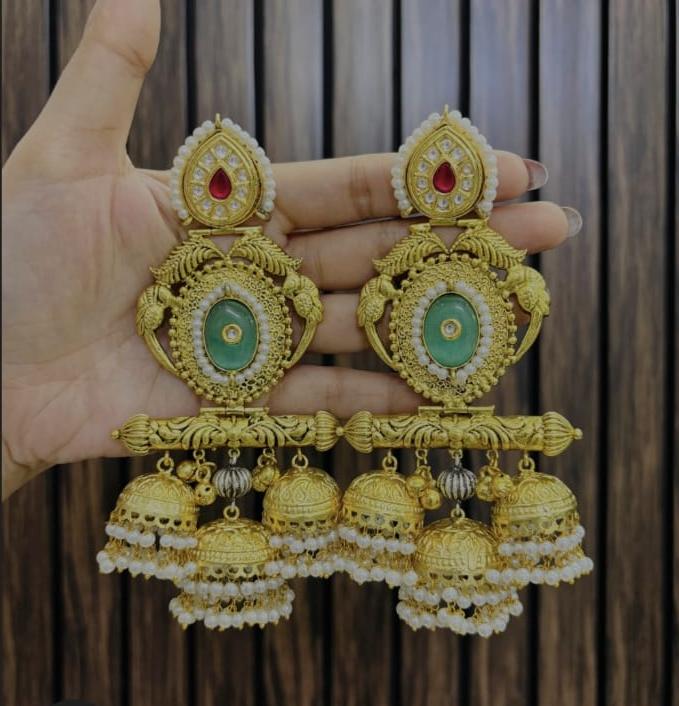 Radiate timeless charm with these magnificent multi-layered jhumkas, a true masterpiece of traditional craftsmanship. Featuring a stunning contrast of soft mint-green stones and vibrant ruby-red drops, these gold-toned earrings are beautifully detailed with intricate floral carvings, elegant bird motifs, and delicate pearl clusters. The dramatic triple-jhumka design adds a regal sway to your every movement, making them the perfect choice for weddings, festivals, or any occasion where you want to stand out with sophisticated ethnic elegance.