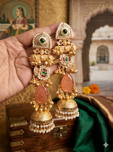 Capture the essence of royal tradition with these breathtaking multi-tier Jhumka earrings, a true masterpiece of artisanal design. These statement pieces feature a luxurious gold-toned finish, intricately detailed with emerald green accents, delicate pearl beadwork, and a striking peach-colored teardrop stone that adds a soft, romantic glow. The elongated silhouette transitions into classic temple-style domes, finished with a fringe of tiny seed pearls for graceful movement and a regal touch. Perfectly suited for a festive celebration or a bridal look, these earrings are designed to be the centerpiece of your ensemble, blending heritage craftsmanship with timeless, sophisticated charm.