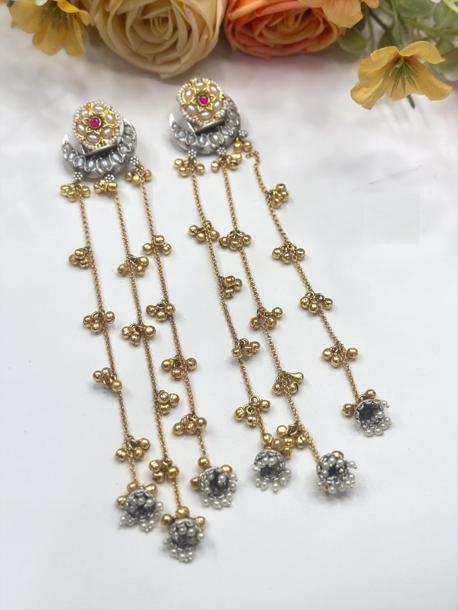 Inspired by the charm of a blooming garden, these earrings radiate timeless beauty. Crafted with intricate golden detailing and adorned with vibrant stones, they reflect the elegance of blossoms in full bloom. Perfect for weddings, festive occasions, or traditional celebrations, these baalis bring a touch of floral grandeur to every look.