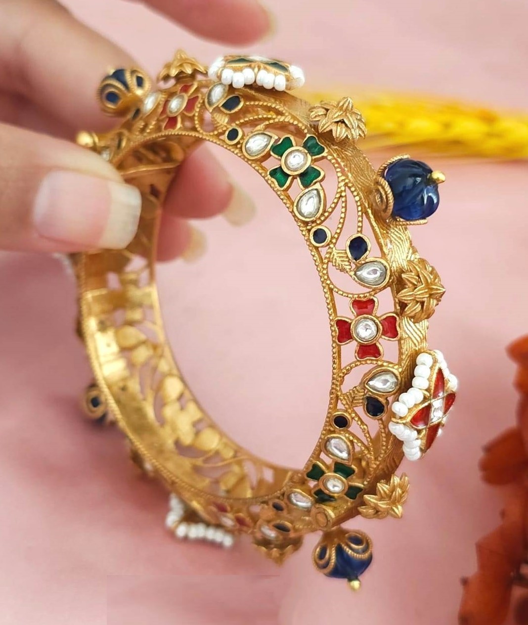 A timeless creation that reflects the grandeur of tradition, the Heritage Kada is adorned with intricate meenakari detailing, radiant kundan work, and delicate pearl accents. Its regal floral motifs and dangling charms capture the essence of royal craftsmanship, making it a statement piece for weddings, festivities, and cultural celebrations. This kada beautifully bridges heritage artistry with everlasting elegance.