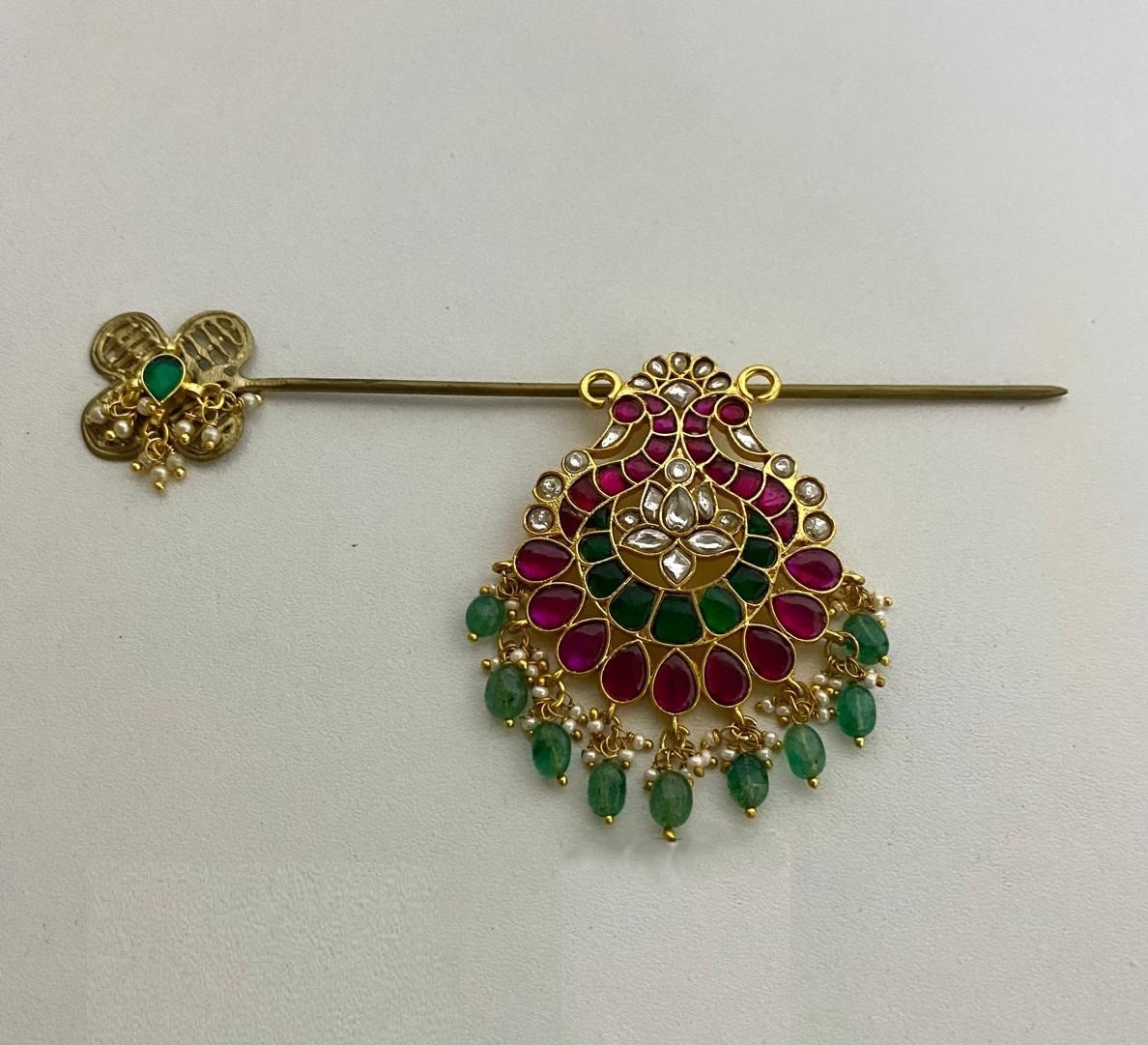 Elevate your hairstyle with the Jinae Hair Charm, a striking fusion of tradition and modern allure. Handcrafted with intricate gold-toned detailing, it features a radiant green emerald centerpiece embraced by shimmering kundan and ruby-red accents.