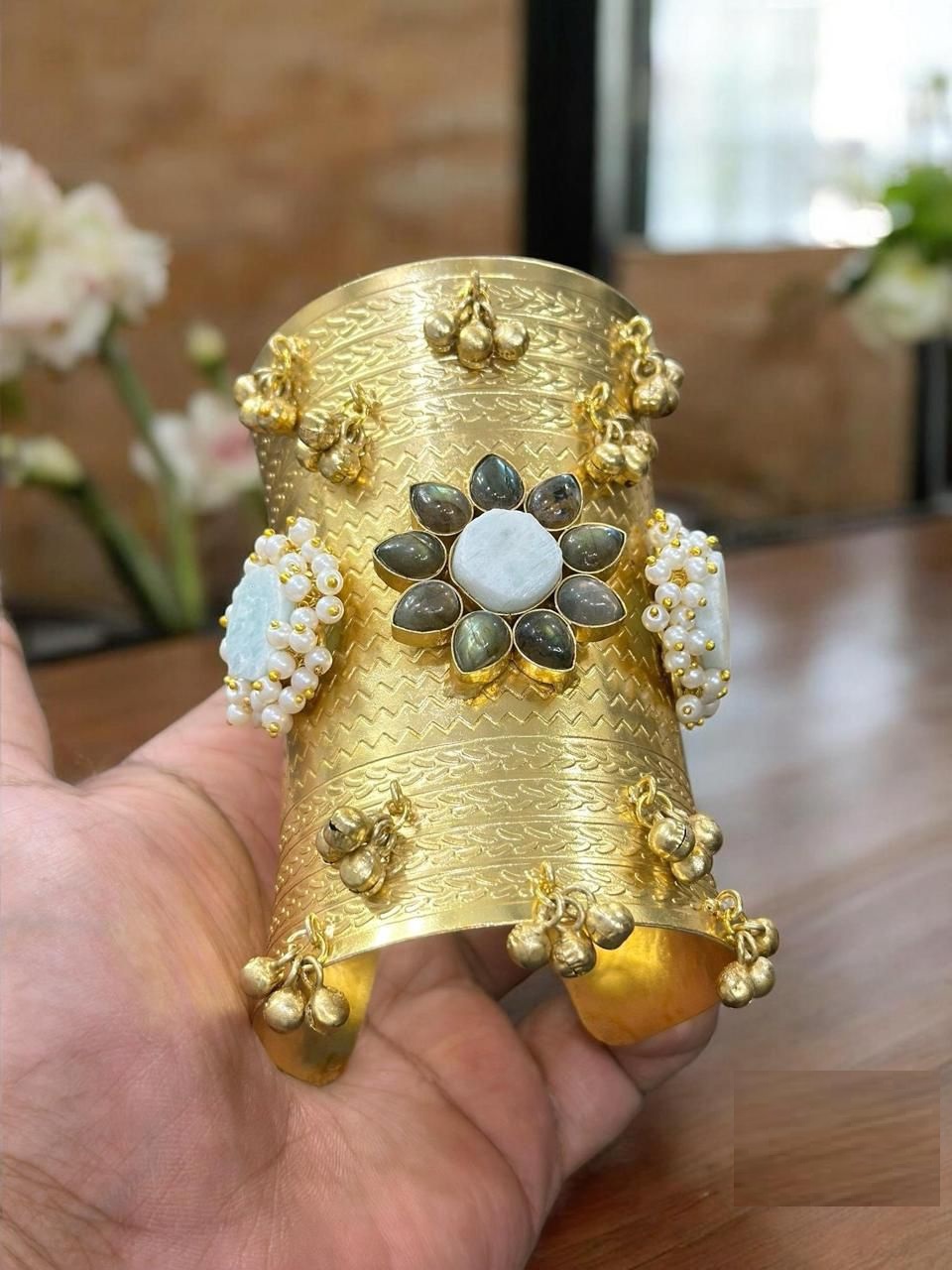 An epitome of regal elegance, the Maharani Kada is designed to capture the grandeur of queens. Crafted with a rich golden finish and embellished with vibrant gemstones and intricate detailing, this kada reflects timeless royalty. Its bold and majestic design makes it the perfect statement piece for weddings, festive occasions, and traditional celebrations, adding a touch of royal charm to every look.