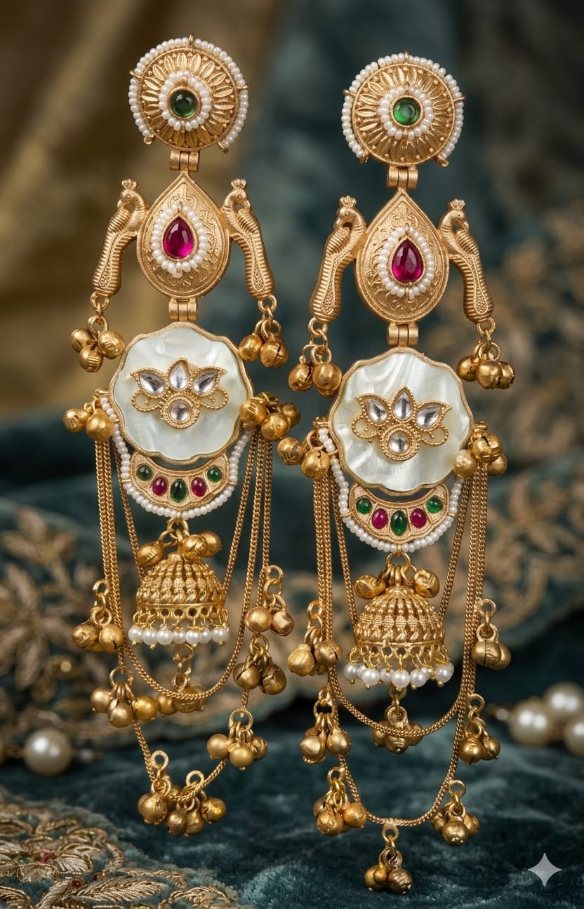 Exude royal sophistication with these Imperial Peacock & Mother-of-Pearl Grand Jhumkas, a masterpiece of traditional Indian craftsmanship designed for the modern connoisseur. These statement earrings feature an intricate interplay of hand-carved golden peacocks, vibrant ruby and emerald accents, and a central Kundan-set lotus blooming atop a luminous mother-of-pearl canvas. Finished with a classic dome jhumka and a dramatic cascade of multi-strand gold chains and rhythmic ghungroos, this pair offers breathtaking movement and timeless elegance, making it the ultimate accessory for brides and grand festive celebrations.