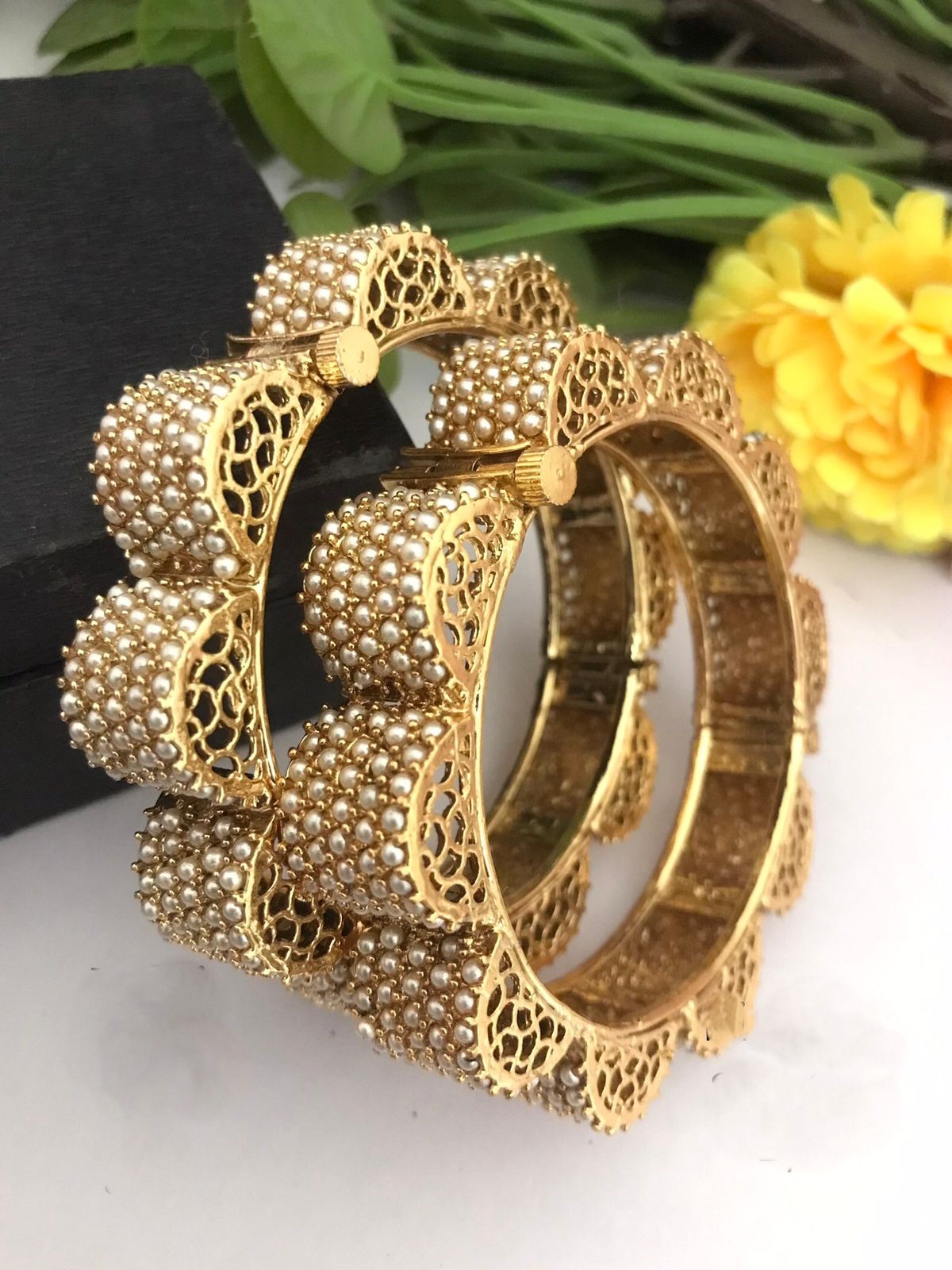 Radiating timeless charm, the Noor-e-Polki Kada is a masterpiece of traditional elegance. Hand-crafted with intricate filigree work and clusters of lustrous pearls, its golden lattice shimmers with every movement, capturing the essence of royal heritage. Perfect for weddings, festive celebrations, or special evenings, this kada adds a regal glow and effortless sophistication to any outfit.