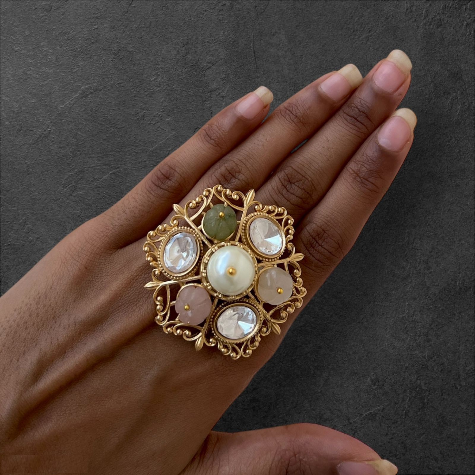A true statement of royal elegance, the Pearl Majesty Ring features a grand central pearl embraced by sparkling gemstones and intricate golden filigree. Its bold yet graceful design reflects timeless sophistication, making it the perfect adornment for weddings, festive occasions, and regal celebrations. This masterpiece is more than a ring — it’s a symbol of majesty, heritage, and enduring beauty.