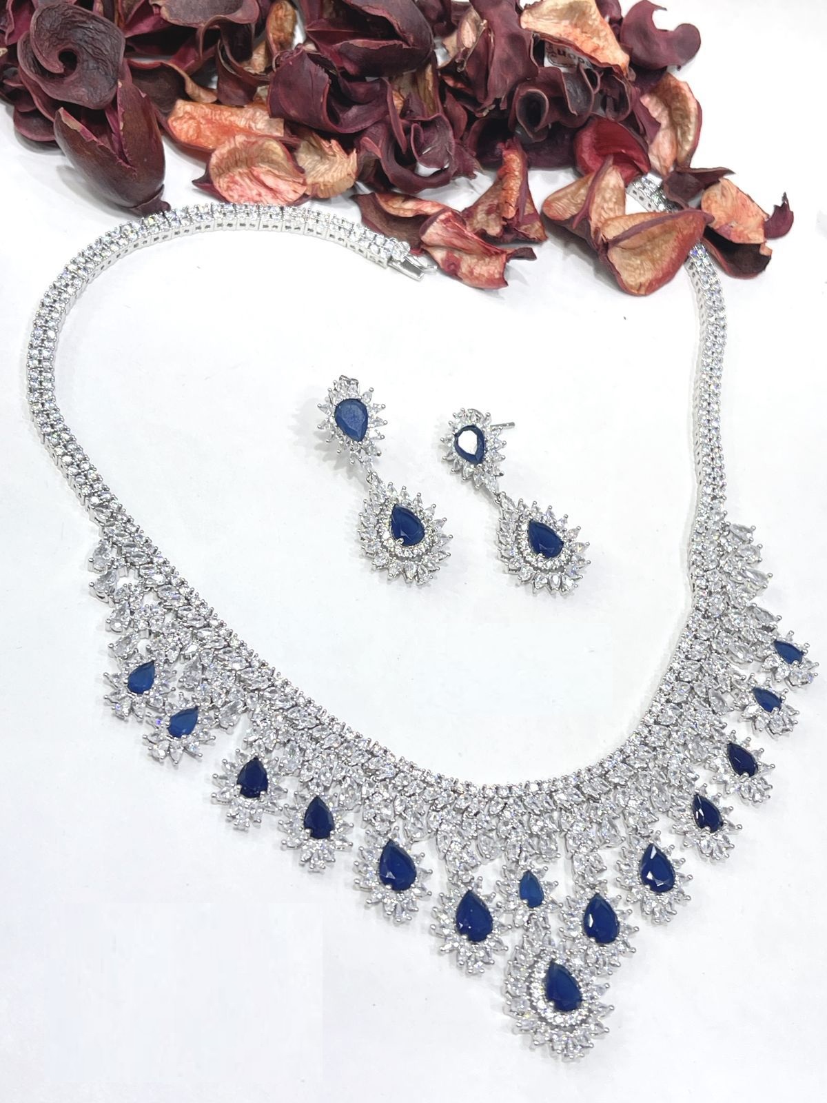 Immerse yourself in the captivating charm of the Royal Blue Mirage, a jewelry set that embodies regal elegance and enchanting sparkle. Brilliant teardrop stones in deep sapphire hues are encircled by glistening cubic zirconia, creating the illusion of shimmering water under moonlight. The coordinating earrings complete the look with a graceful touch of luxury.