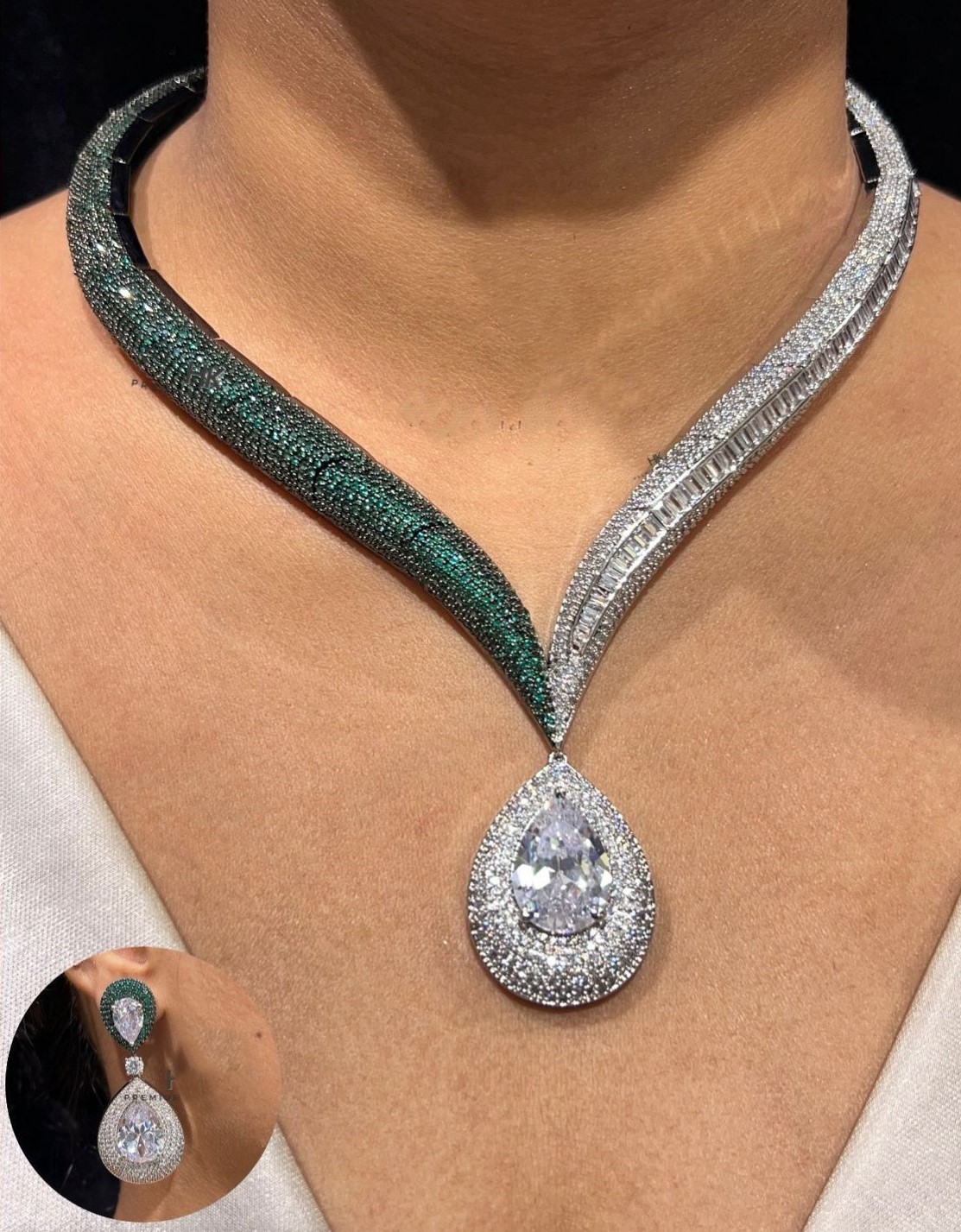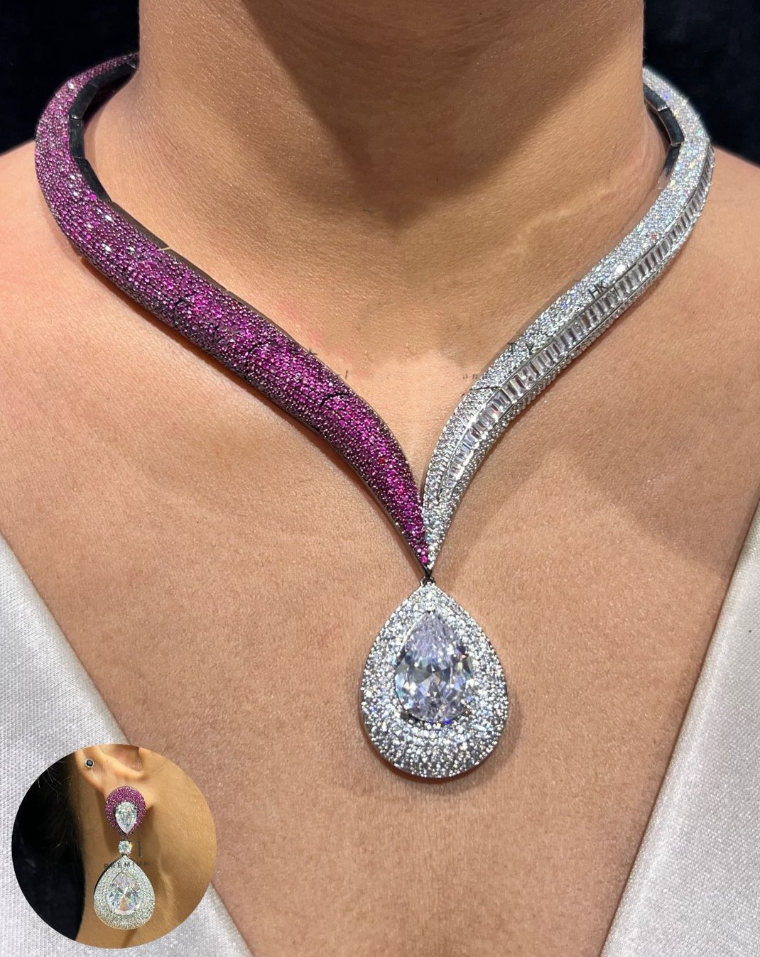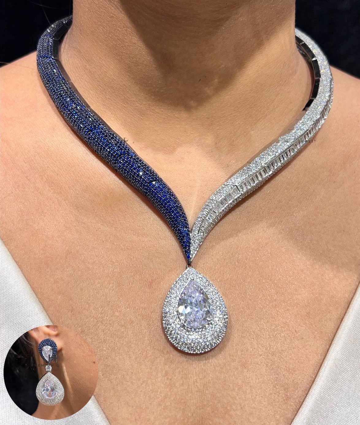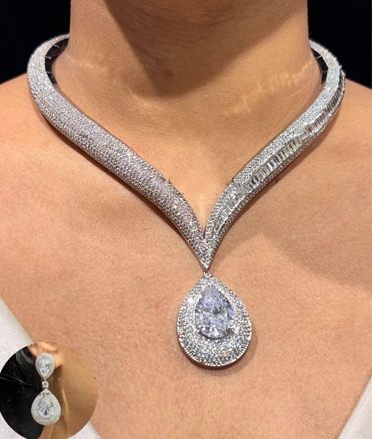 A masterpiece of timeless elegance, this necklace captures the grandeur of royalty with its dazzling brilliance. Adorned with meticulously set diamonds and crowned with a teardrop centerpiece, it reflects light from every angle, exuding unmatched sparkle. Crafted to perfection, it embodies luxury, sophistication, and radiant charm – a jewel fit for a queen.