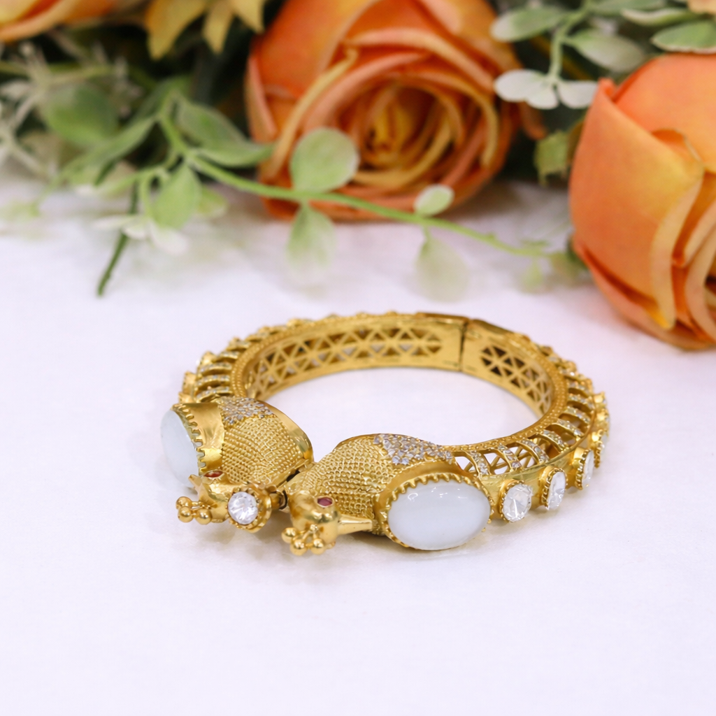 This exquisite gold bangle embodies timeless elegance with a distinctive artistic flair, featuring intricately crafted peacock-inspired motifs that symbolize grace and beauty. The finely textured surface is complemented by delicate lattice detailing, while luminous white stones add a soft, sophisticated contrast to the rich gold tone. Designed for those who appreciate uniqueness and premium craftsmanship, this piece effortlessly blends traditional charm with modern luxury, making it a standout addition to any jewelry collection.