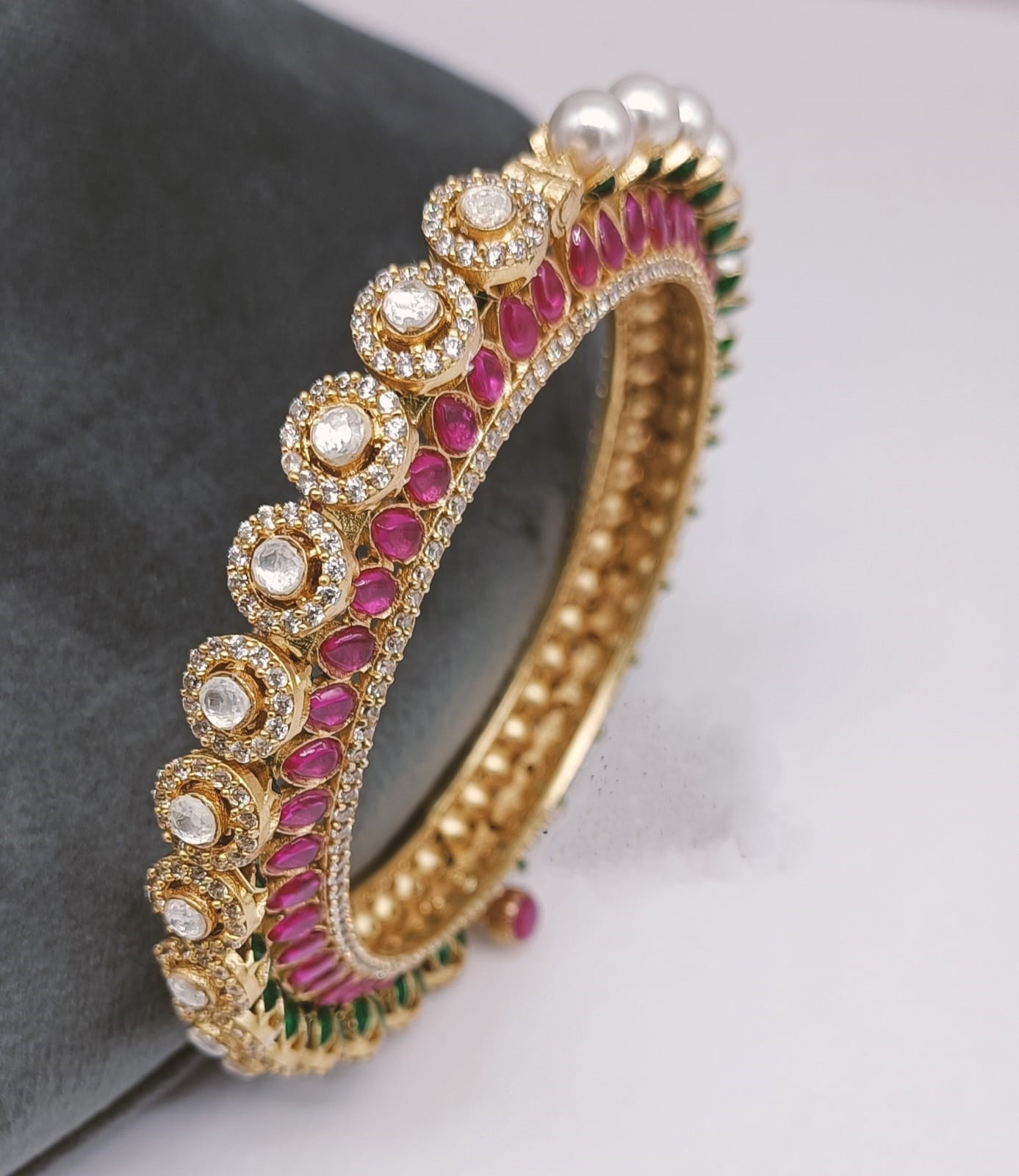 A captivating fusion of tradition and luxury, the Ruby Dew Halo bangle features a radiant gold finish highlighted with shimmering moissanite stones and deep ruby-toned gems. Each circular motif glistens like morning dew kissed by sunlight, creating a graceful halo effect around your wrist. Perfect for weddings, festive occasions, or elegant soirées, this openable bangle blends timeless Kundan artistry with a modern sparkle, making it a statement piece for any jewelry collection.