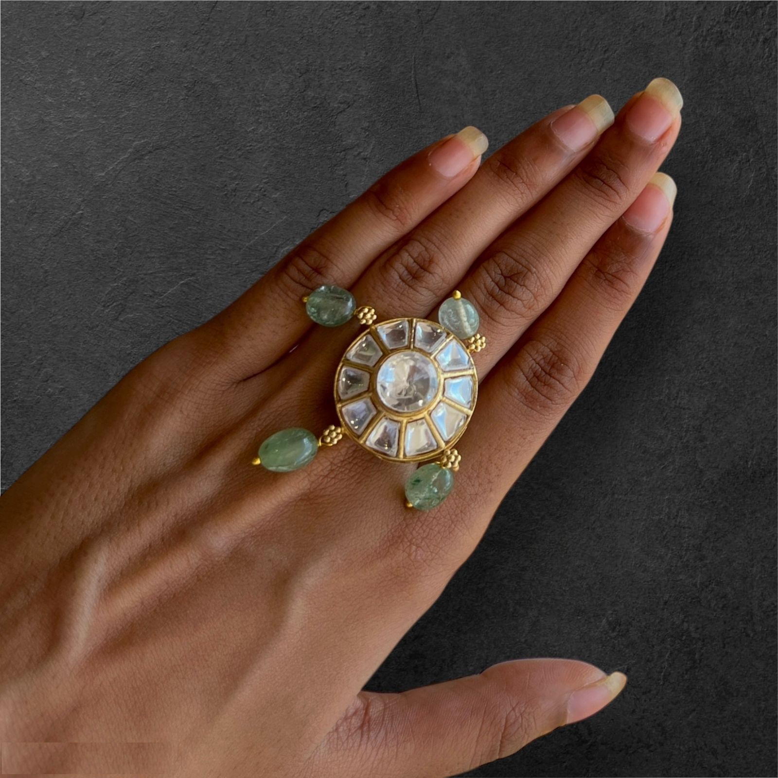 Inspired by royal elegance and floral beauty, the Shahi Blossom Ring is a true statement of luxury. Featuring a radiant pearl at its heart, surrounded by sparkling gemstones in a blooming floral design, it captures the essence of regal charm. Perfect for weddings, festive occasions, and timeless celebrations, this ring adds a majestic touch to every ensemble, making you shine like royalty.