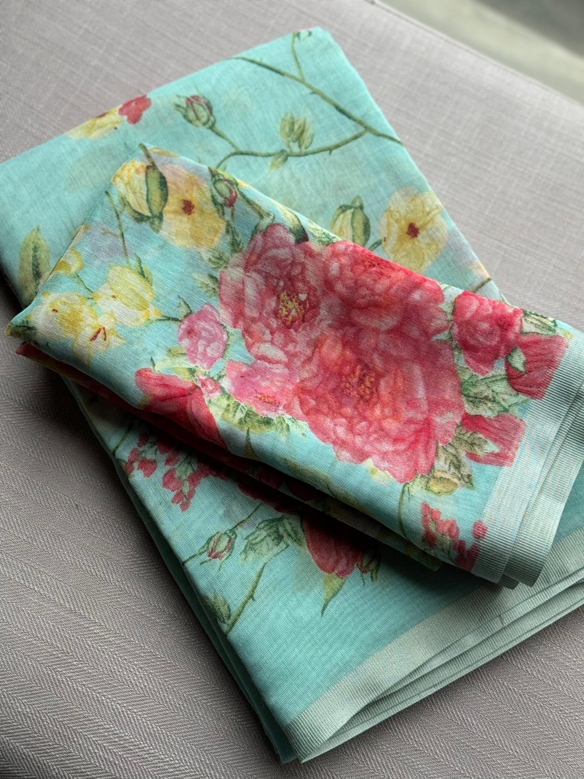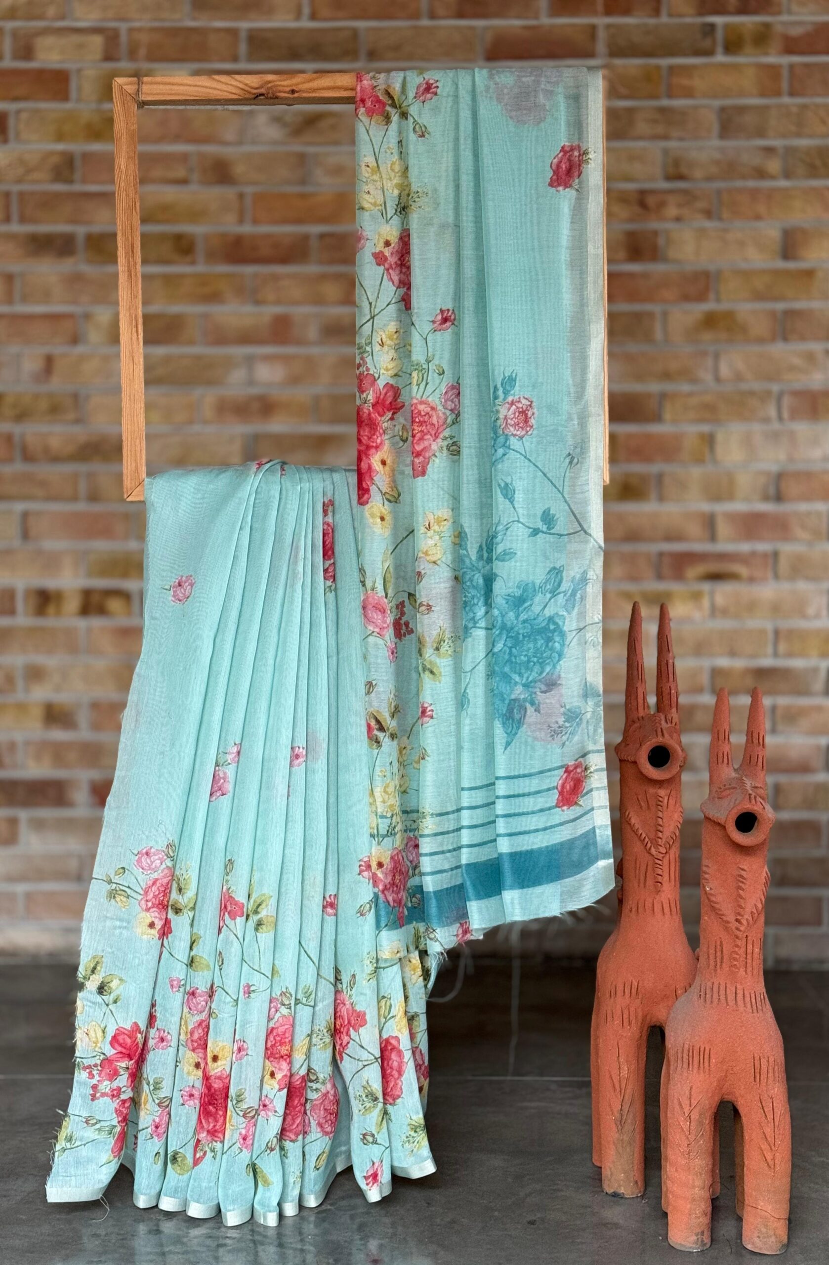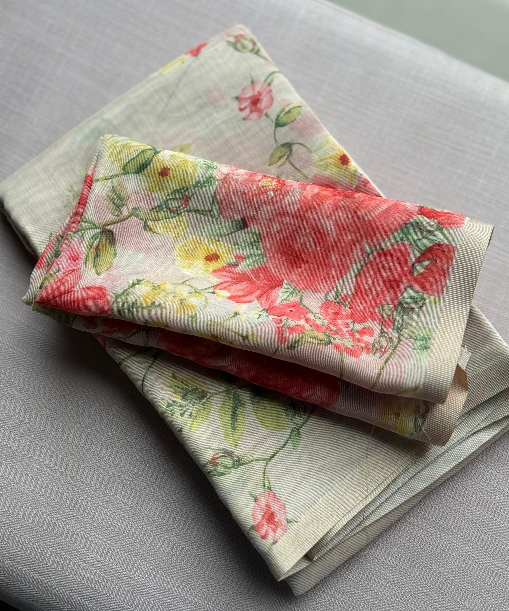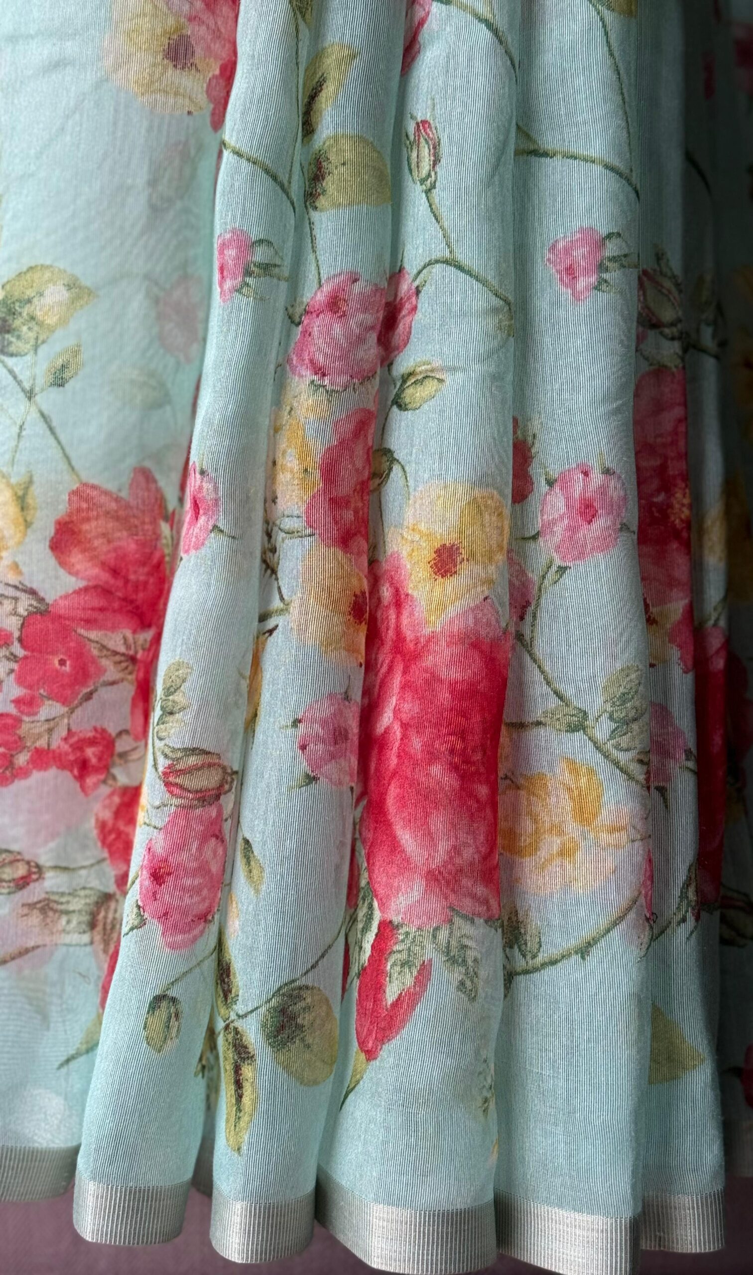 This silk linen fabric gives an all new digital floral experience. It has weaving zari border on both side. It’s digital floral printed blouse adds to the beauty of this product.