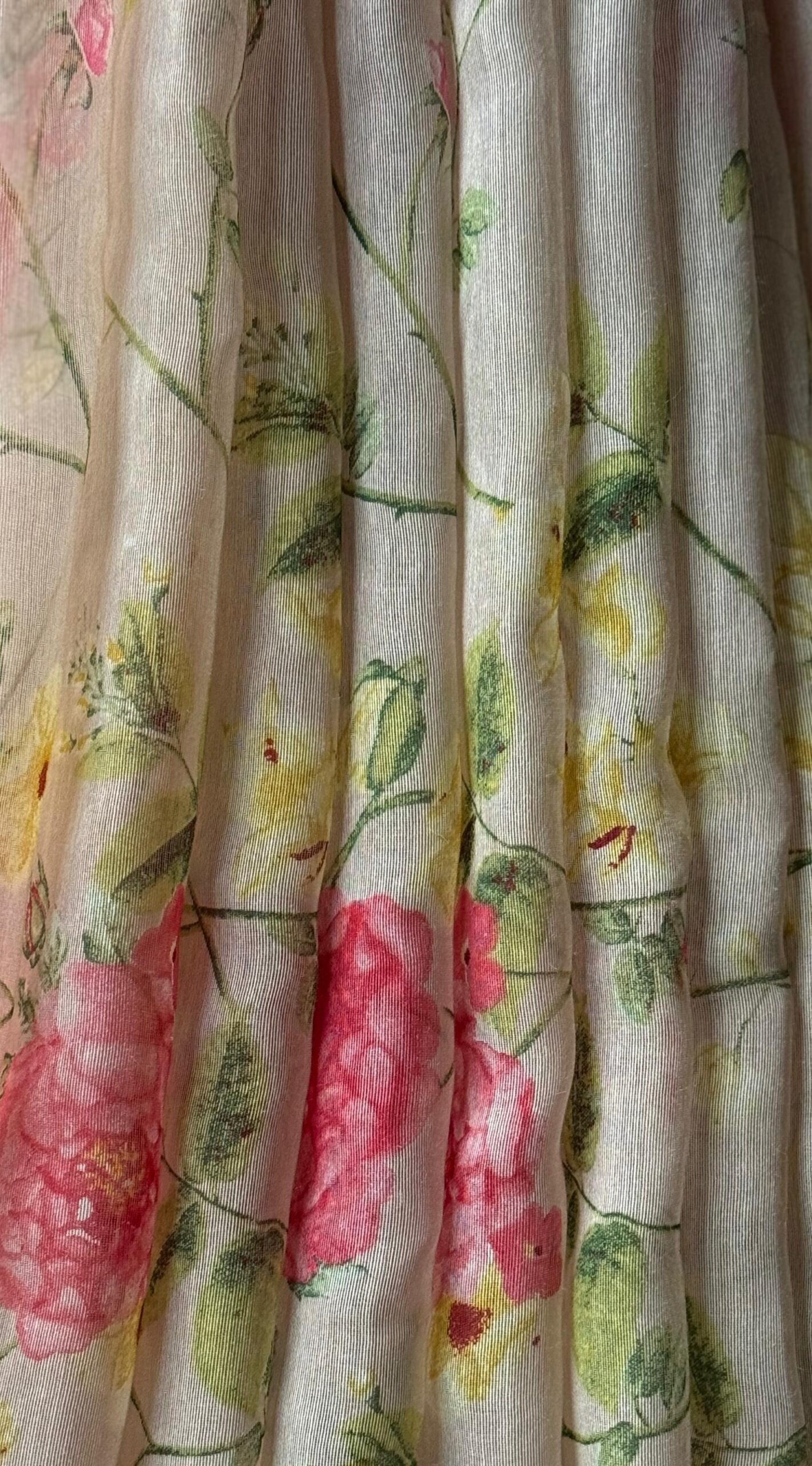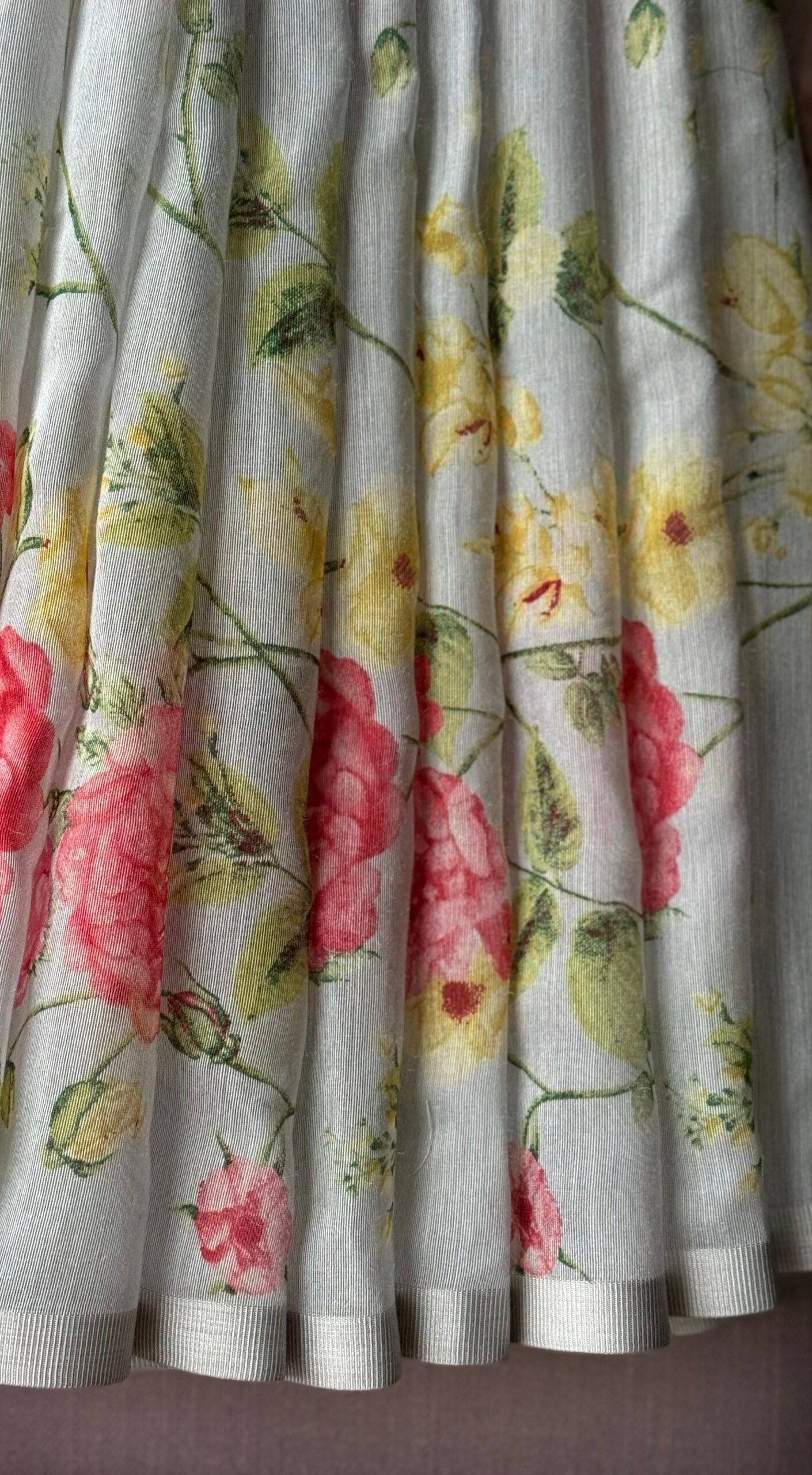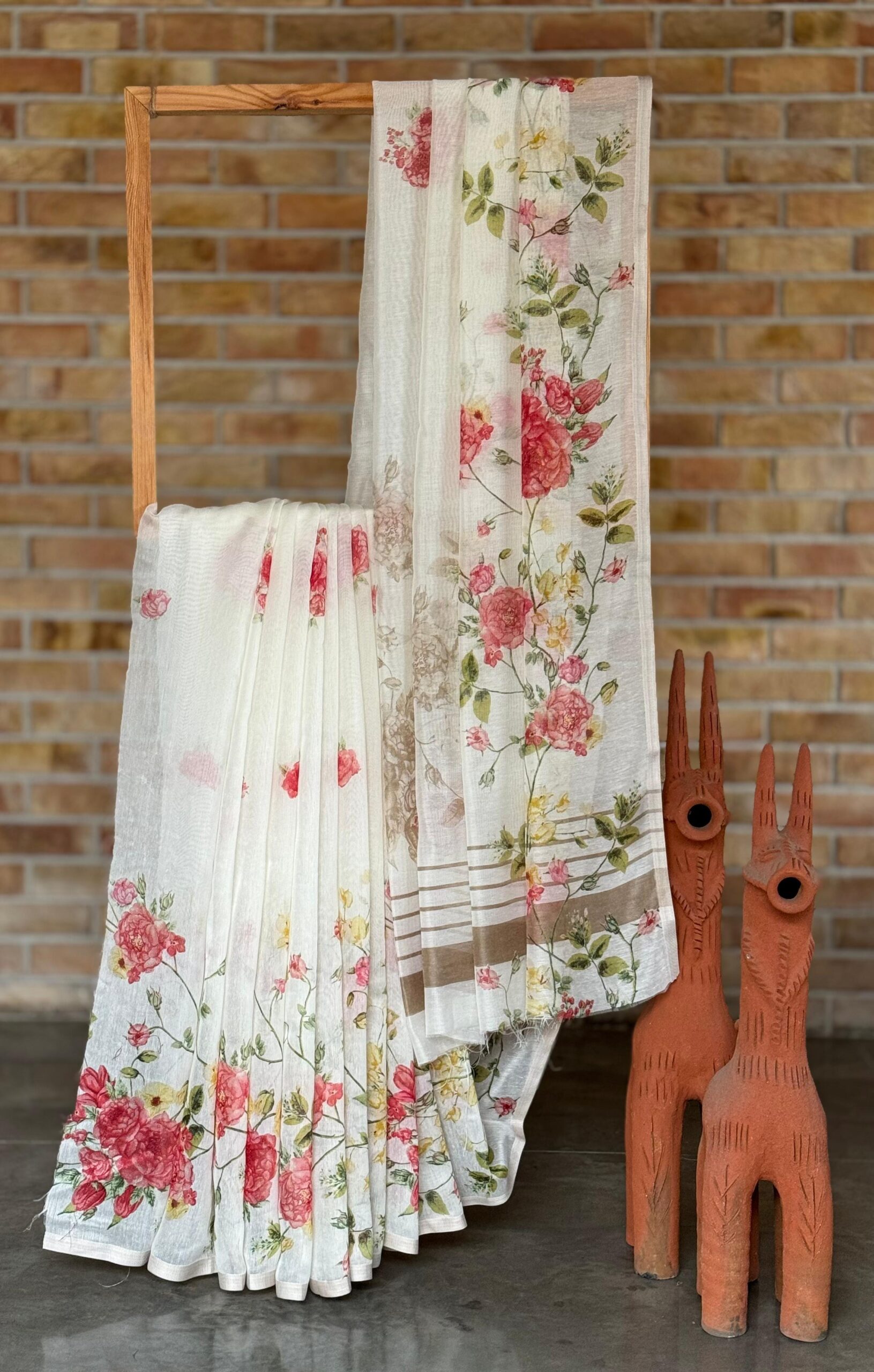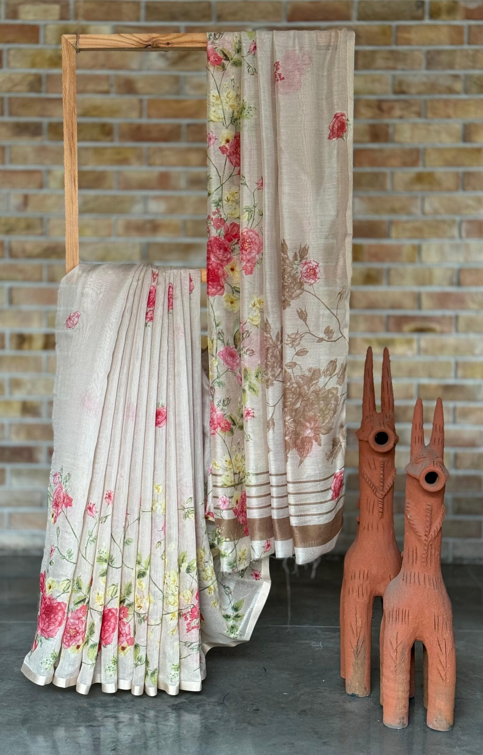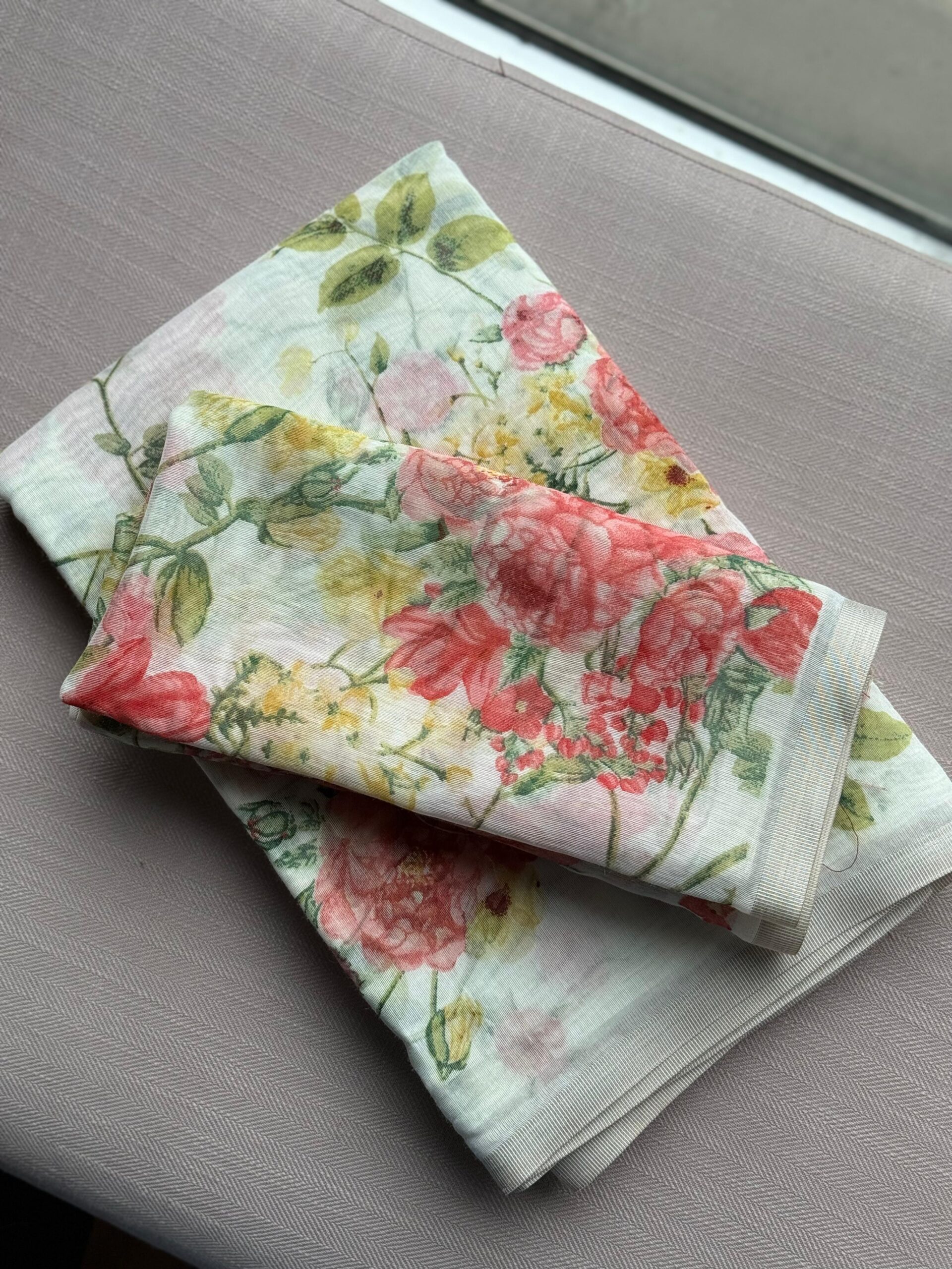 This silk linen fabric gives an all new digital floral experience. It has weaving zari border on both side. It’s digital floral printed blouse adds to the beauty of this product.