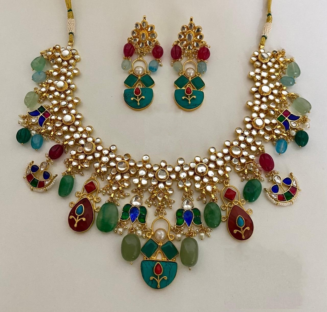 Inspired by the freshness of spring, this exquisite necklace blooms with pastel-toned stones, shimmering kundan work, and intricate detailing. Each petal-shaped gem mirrors the gentle hues of nature—peach, mint, and green—coming together in a radiant floral symphony. Centered with a regal motif, the necklace is paired with matching earrings, making it the perfect adornment for festive occasions, weddings, or timeless celebrations.
