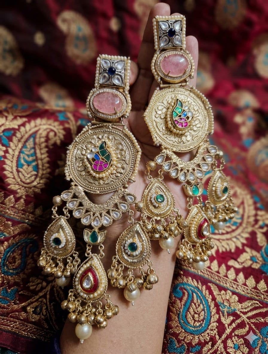 Embrace the allure of heritage with these breathtaking oversized chandelier earrings, designed for the woman who loves a touch of royal grandeur. These statement pieces feature an intricate gold-finished medallion base, beautifully accented with a soft pink cabochon stone and a vibrant, multicolored peacock motif at the center. The dramatic silhouette is further enhanced by cascading kundan-studded teardrops and delicate pearl drops that add a graceful movement to the design. Whether paired with a classic saree or a festive lehenga, these earrings are the ultimate celebration of traditional craftsmanship and bold, contemporary style.