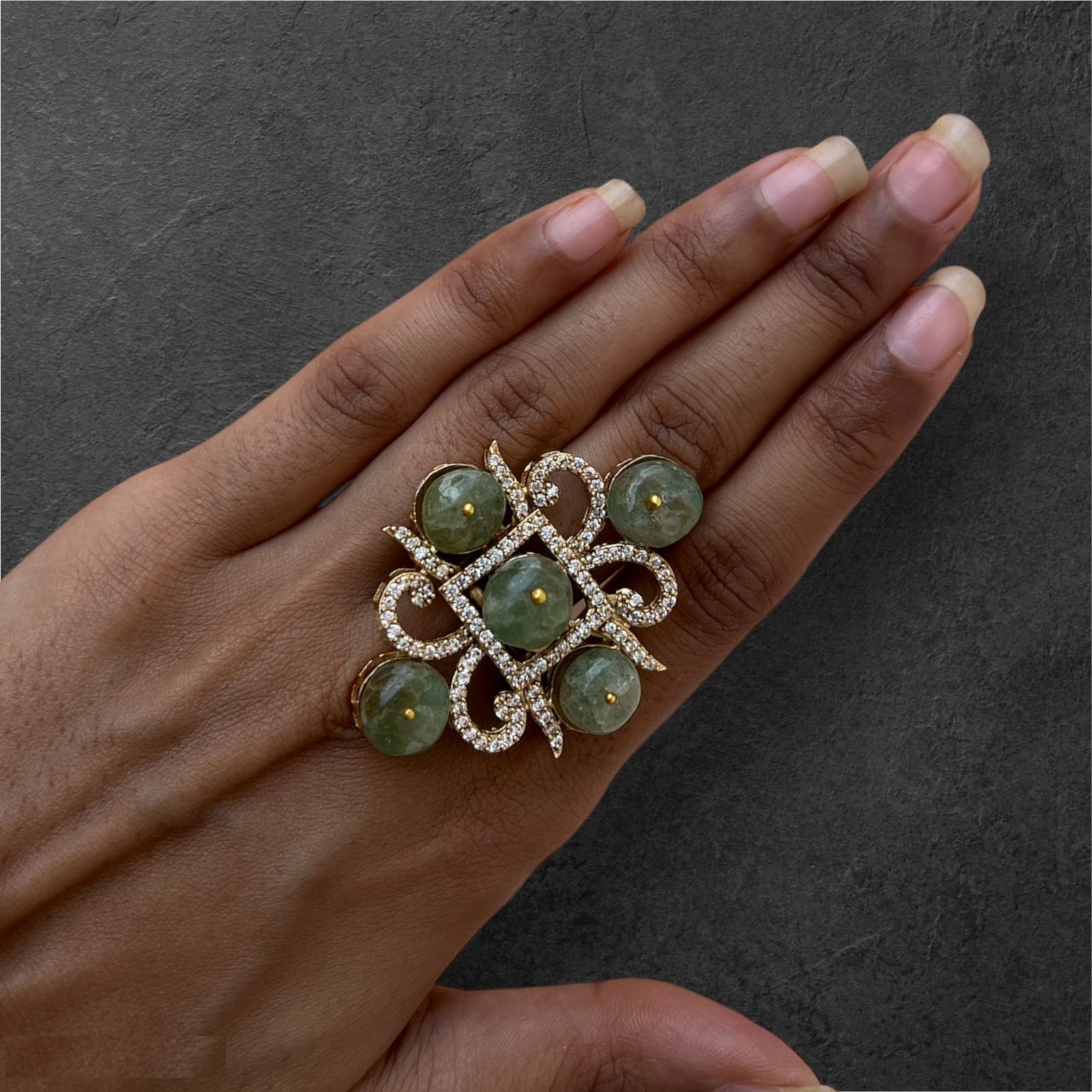 A stunning fusion of floral beauty and regal charm, the Zarreen Bloom Ring is adorned with a radiant central pearl and sparkling gemstones, set against intricate golden artistry. Its blooming design symbolizes grace and prosperity, making it a perfect statement piece for weddings, festive occasions, and timeless celebrations. Elegant yet bold, this ring brings a touch of royal bloom to every look.